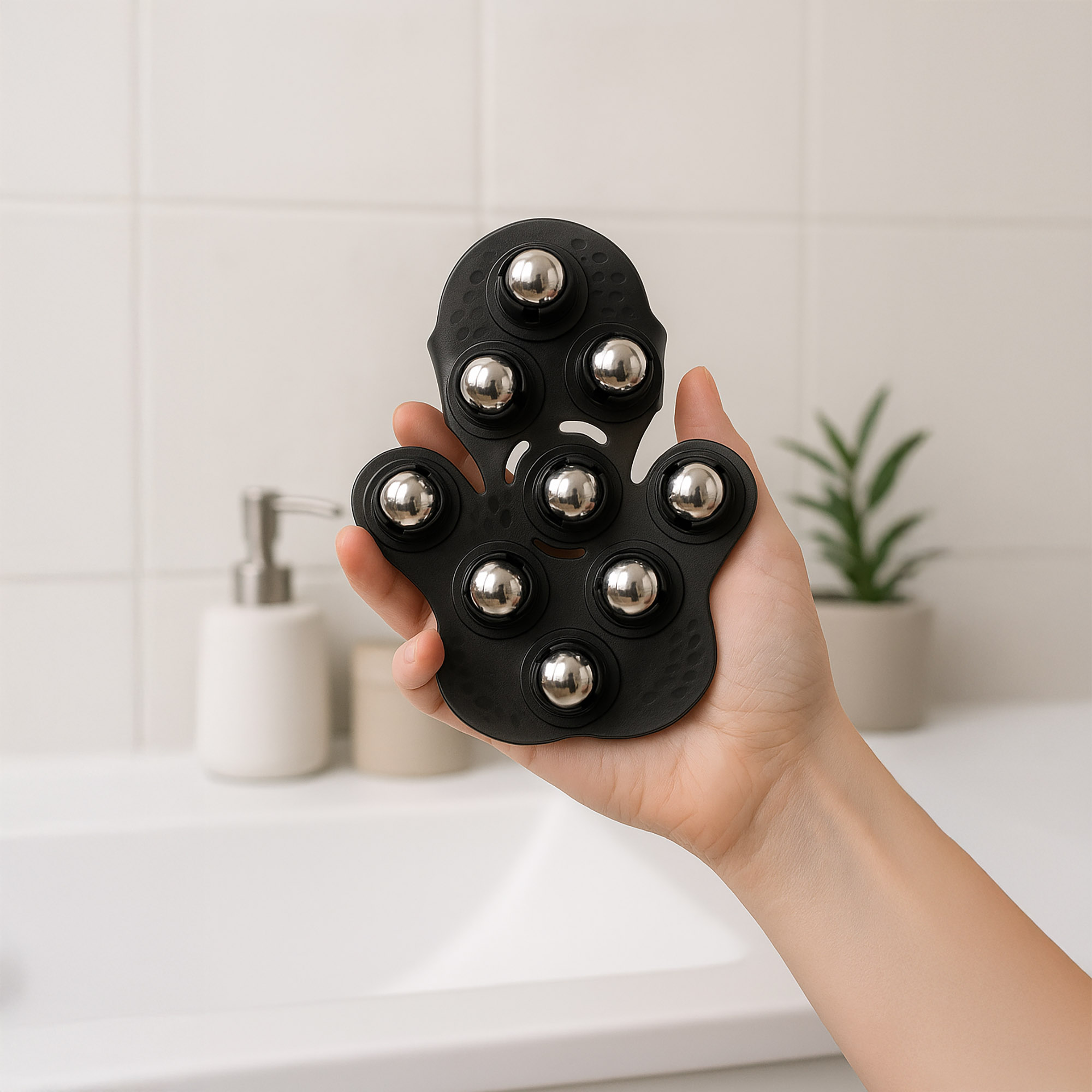 - Głębokie Ujędrnianie i Redukcja Cellulitu: Dzięki 9 metalowym kulom, rękawica do masażu antycellulitowego działa na głębsze warstwy skóry i tkanki podskórnej. W przeciwieństwie do tradycyjnych masażerów, ruch 360° kul intensywnie rozbija zastoje limfatyczne i komórki tłuszczowe, co przyczynia się do widocznej redukcji cellulitu.